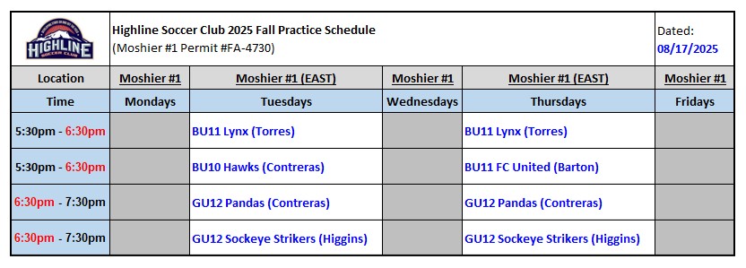 BU13 Highline United (Lewis) | Valley Ridge #2, M/W, 6:30-8:00 |